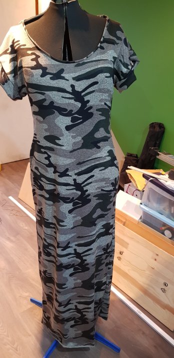 I’ve seen a few IG posts using camouflage print jersey and I really liked them and I figured this should be a pretty easy conversion, I use the same technique from the pattern I made earlier this year but just need to lengthen to add a maxi skirt. The overlocker will be carrying the brunt of the work and this time I want to do a self-bound neckline rather than just turn over the edge as I did with the t-shirt.