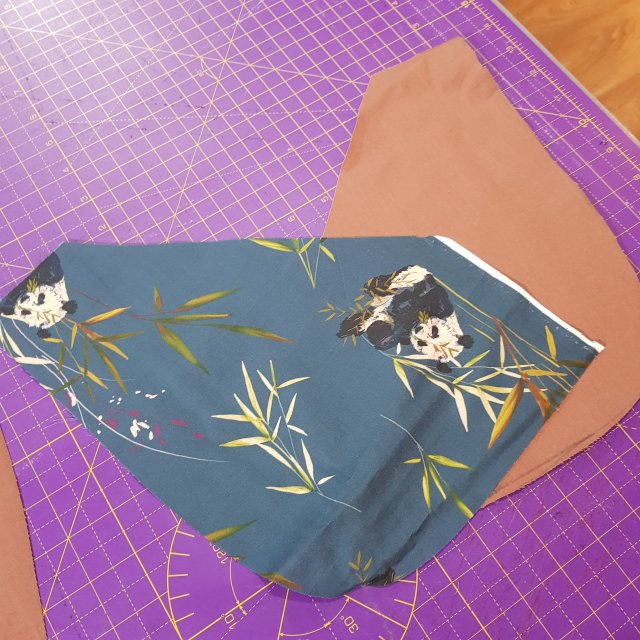 I find trousers are relatively easy to sew, if not fit and so I started with them. I have made adjustments to my block to cater for my short front rise and long back rise, I seem to have got it about right on this one. I made a template for my front patch pockets based on the trousers – slanted so that I could actually get my hands in and then curved around the edge. The side will be stitched into the side seam of the pants. I cut lining from some printed cotton I won in a giveaway last year – it was a pandas print which was from Minervadotcom originally. When it came to assembling them I realised I had cut the fabric upside down, but well, only you and I will ever know!