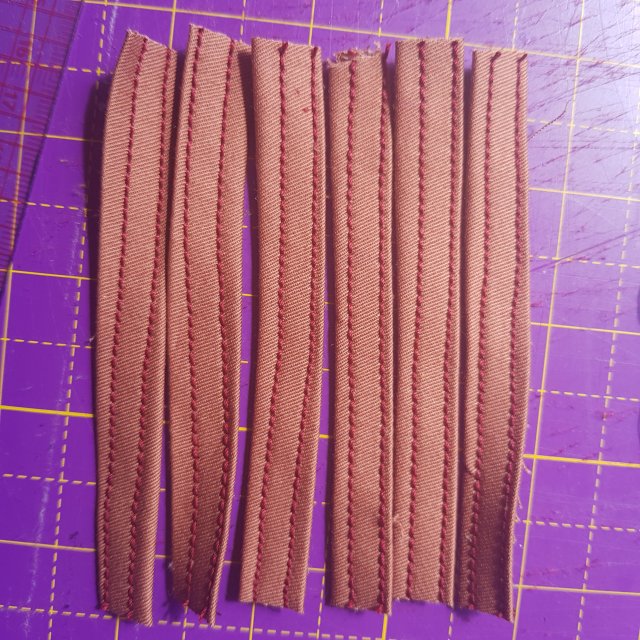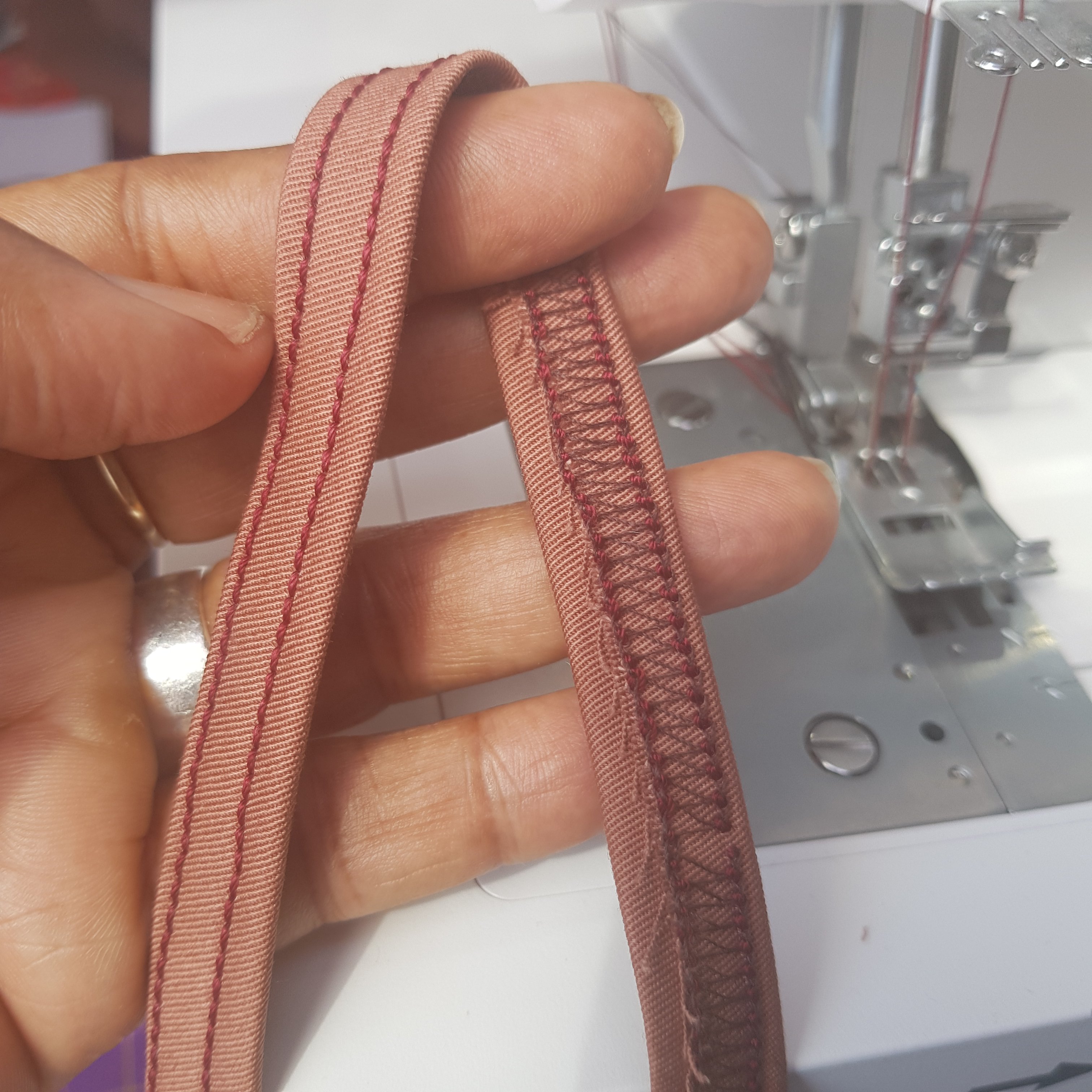 I made belt carriers by cutting a strip of fabric 80cm long and 3 cm wide. I wanted each loop to be about 10 cm long so that I could wear a wide belt if I wanted to. The length gave me enough for 6 loops – two front, two side and a pair crossed at the back – and allowed a little margin for error. I turned over and pressed the fabric 1 cm in and then folded and pressed again to form a strip approximately 1 cm in width. Using the coverstitch machine, I stitched the belt loop from the right side, width a 5 thread coverstitch. This is the way I will make belt loops henceforth!