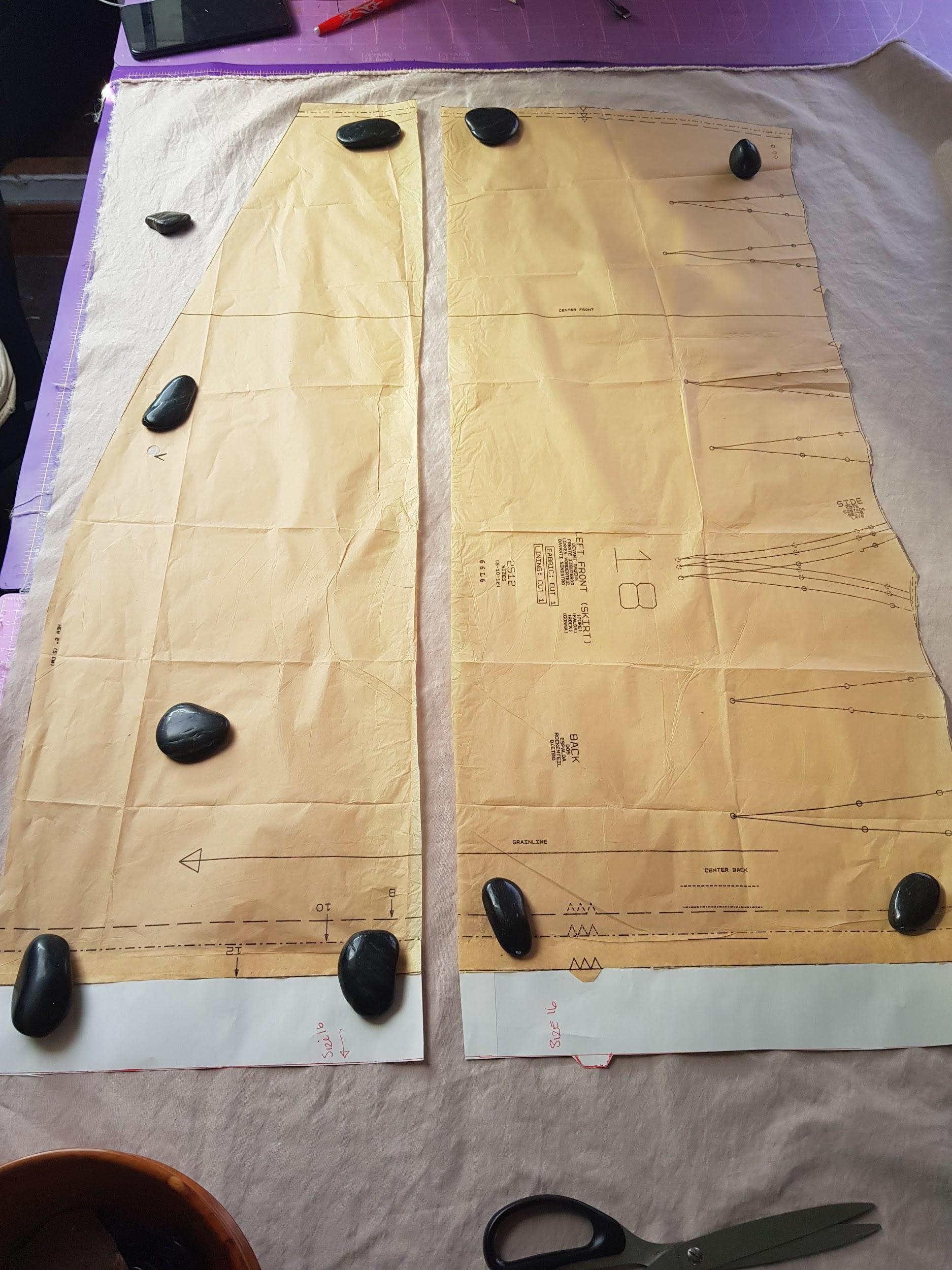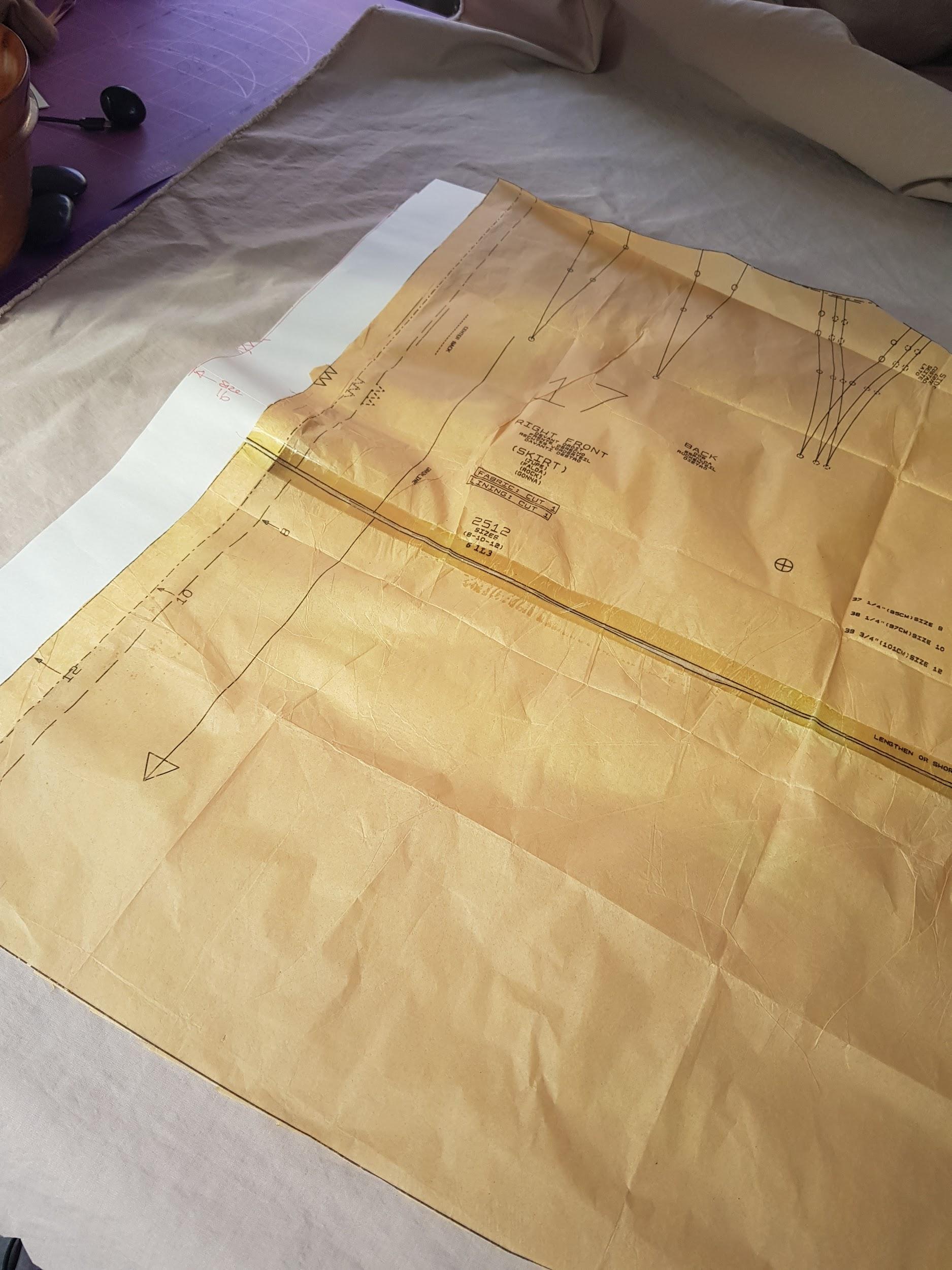 The large pattern piece came in two sections and you can see where I joined it, there is a strip of browned sellotape across the skirt pieces.