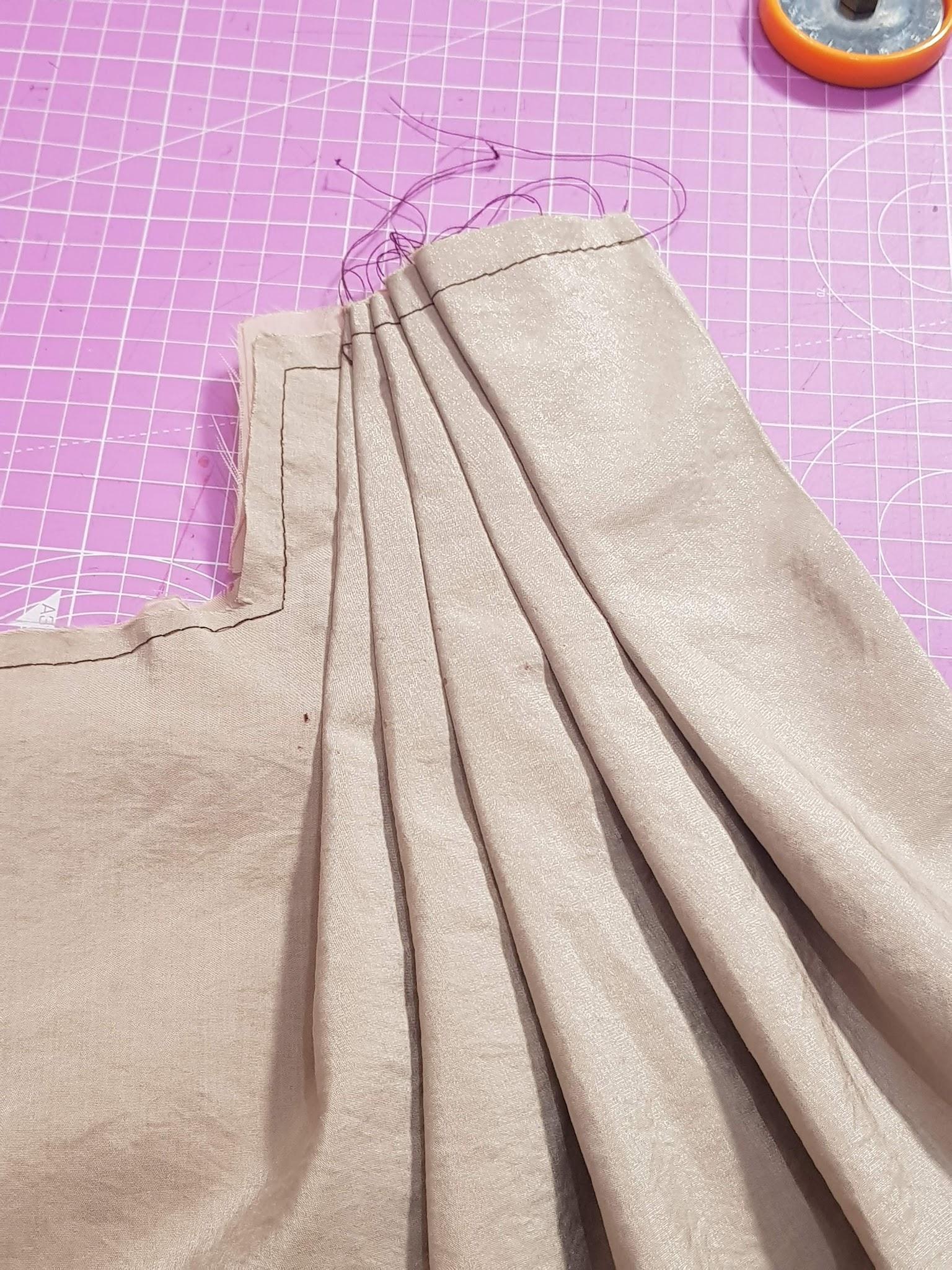 There is an interesting combination of pleats at the front to make the drape – a facing holds it all together to form a waistband which has a casing into which elastic is inserted.