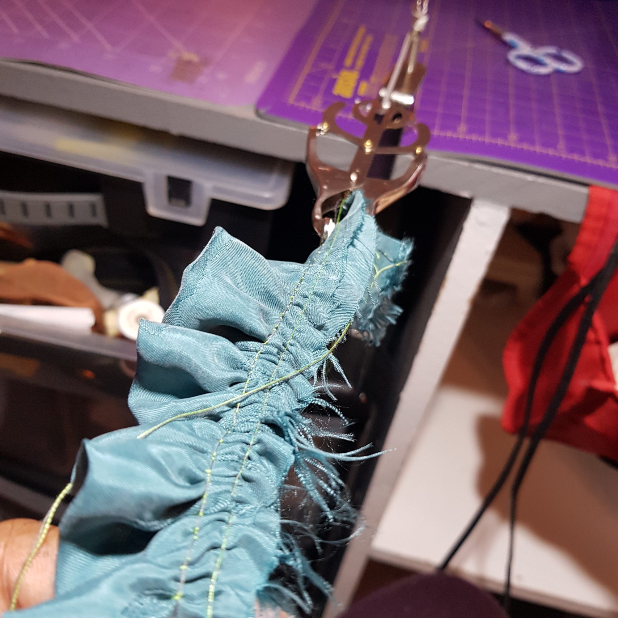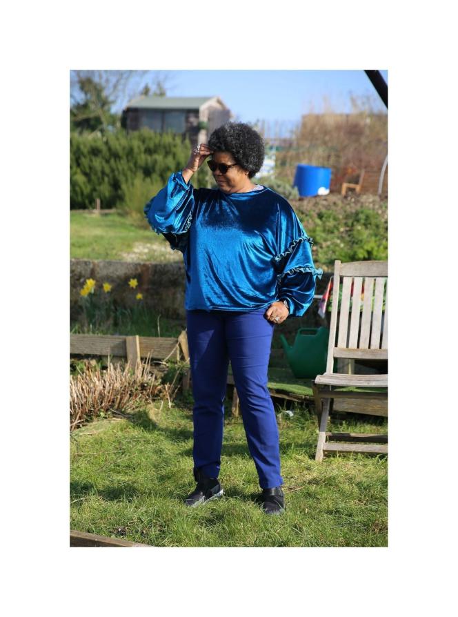 With a nod to my on again off again pledge to work through my fabric stash, I decided to go with some of my electric blue stretch velour to complete this top. It may also be a hangover from my Glitz-fest leading up to Christmas. I paired it with a teal cupro (I think) which has been in my stash for three decades and I’m not joking. It’s something that as usual I bought only two metres of and then when I couldn’t think of what I should make with it, dumped it in the stash. Anyway, I’ve used a small amount of it to make these frills.