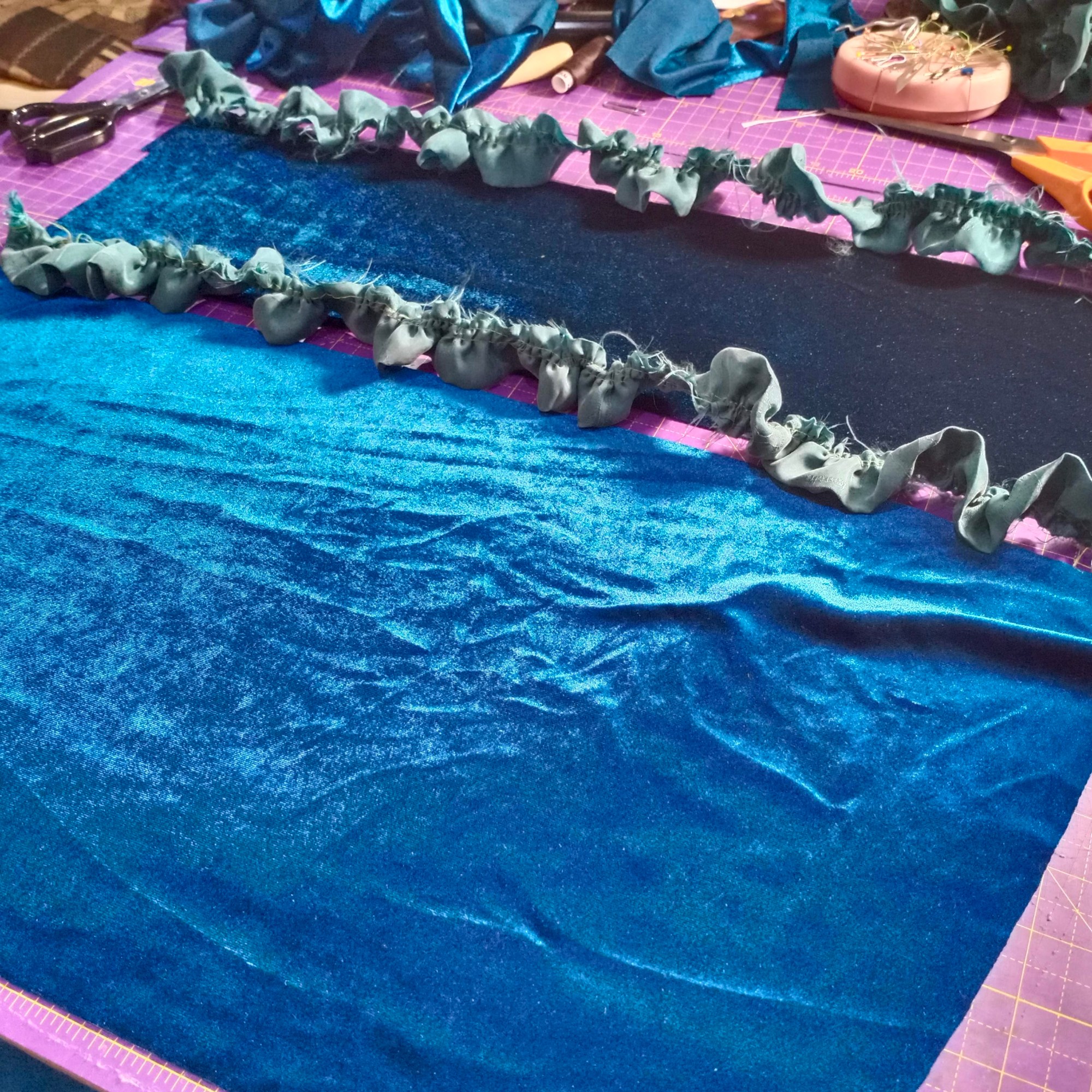 It should have been relatively easy to make but it seems like my two chosen fabrics didn’t agree with each other because when I was trying to install the ruffles they just slithered around against each other like crazy, so that became a bit of a mission. Once I conquered that, however, it came together really nicely. Funnily enough, the velour does not fight itself and I didn’t have too many problems sewing the other seams.