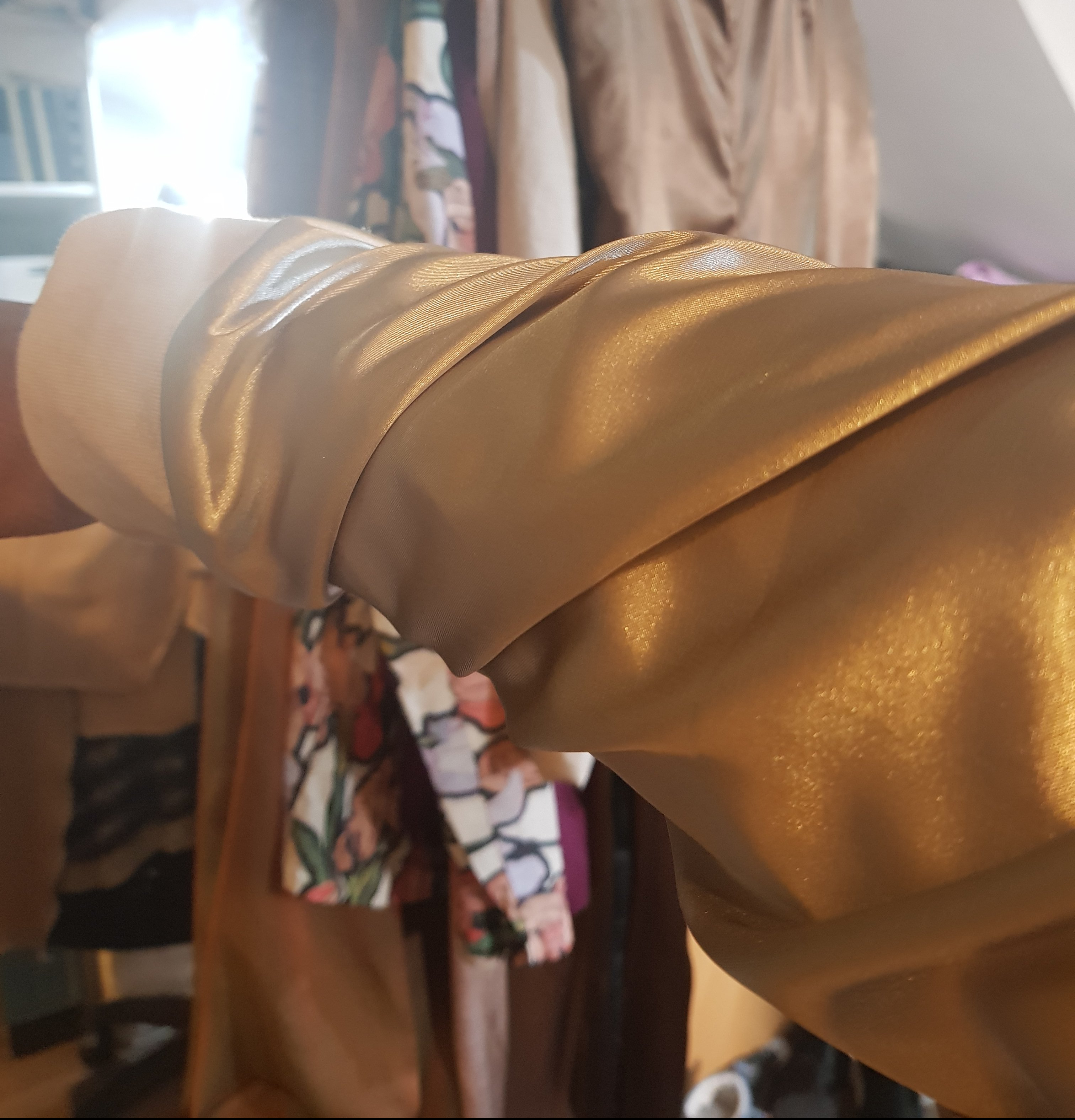 I then joined the sleeves together. This is a little tricky, I had to first attach the ribbed cuff to the outside and then, turn both sleeves inside out and join the hems together so that their right sides are together with the cuff between. When these are stitched together the sleeves must then be pulled back through the outer sleeve. You have to be careful to match the sleeve seams carefully or you can end up with a twisted sleeve, as I experienced when I made my satin bomber.