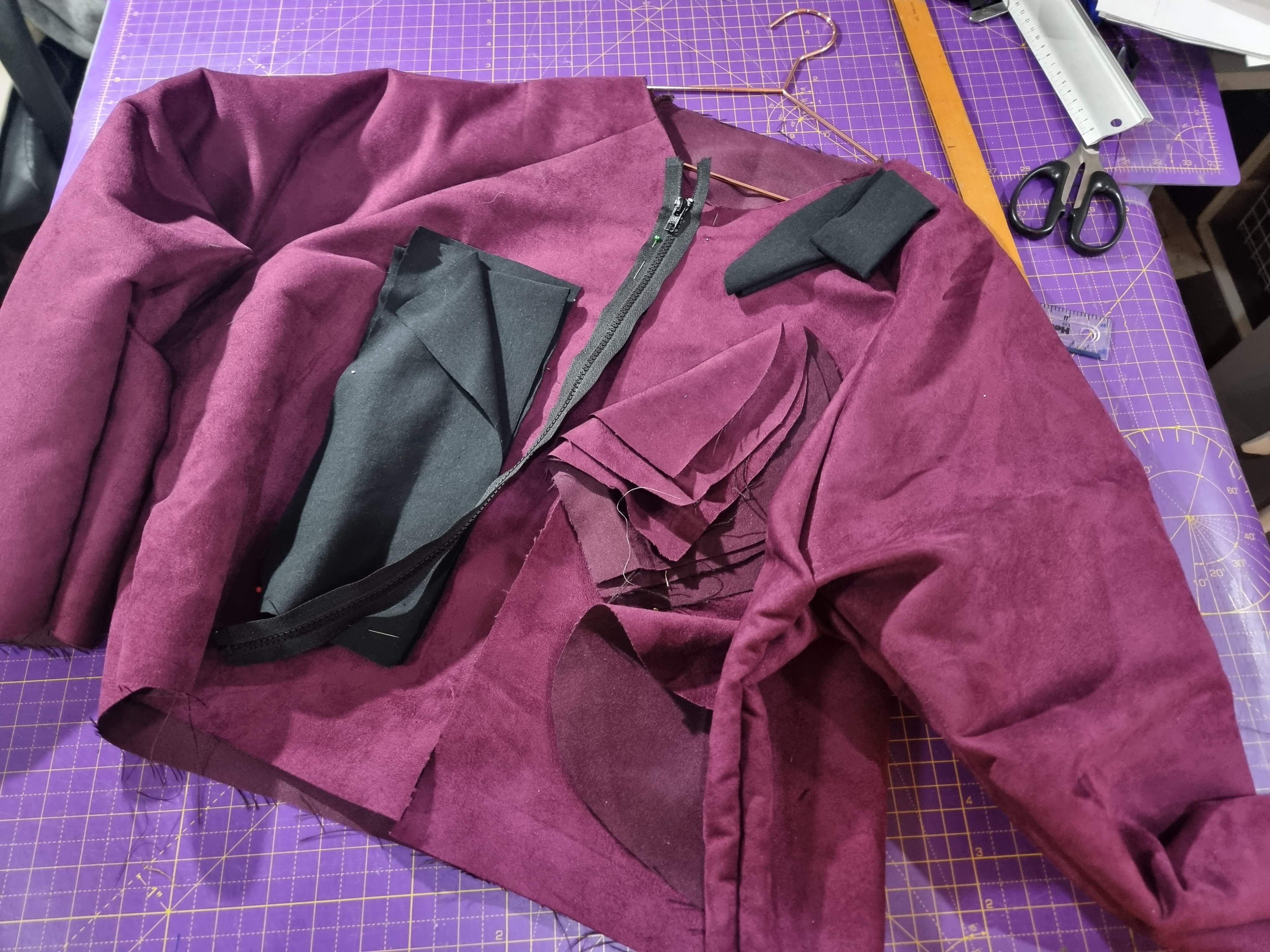 Funnily enough, I bought the fabric for this jacket before I made any of those ones and as is the way with “plans that went astray”, I don’t know why I was hesitating to make it. This burgundy suedette was one of the first pieces of fabric I bought when I decided to resume my sewing hobby. I bought it to make a bomber jacket, but for some reason, it sat for 4 years unmade and then when I cut it out, it sat another year in the UFO pile. It’s not a difficult pattern to sew, so it must just have been that other projects jumped the queue again. Now I look at my pictures, I remember ….. welt pockets.