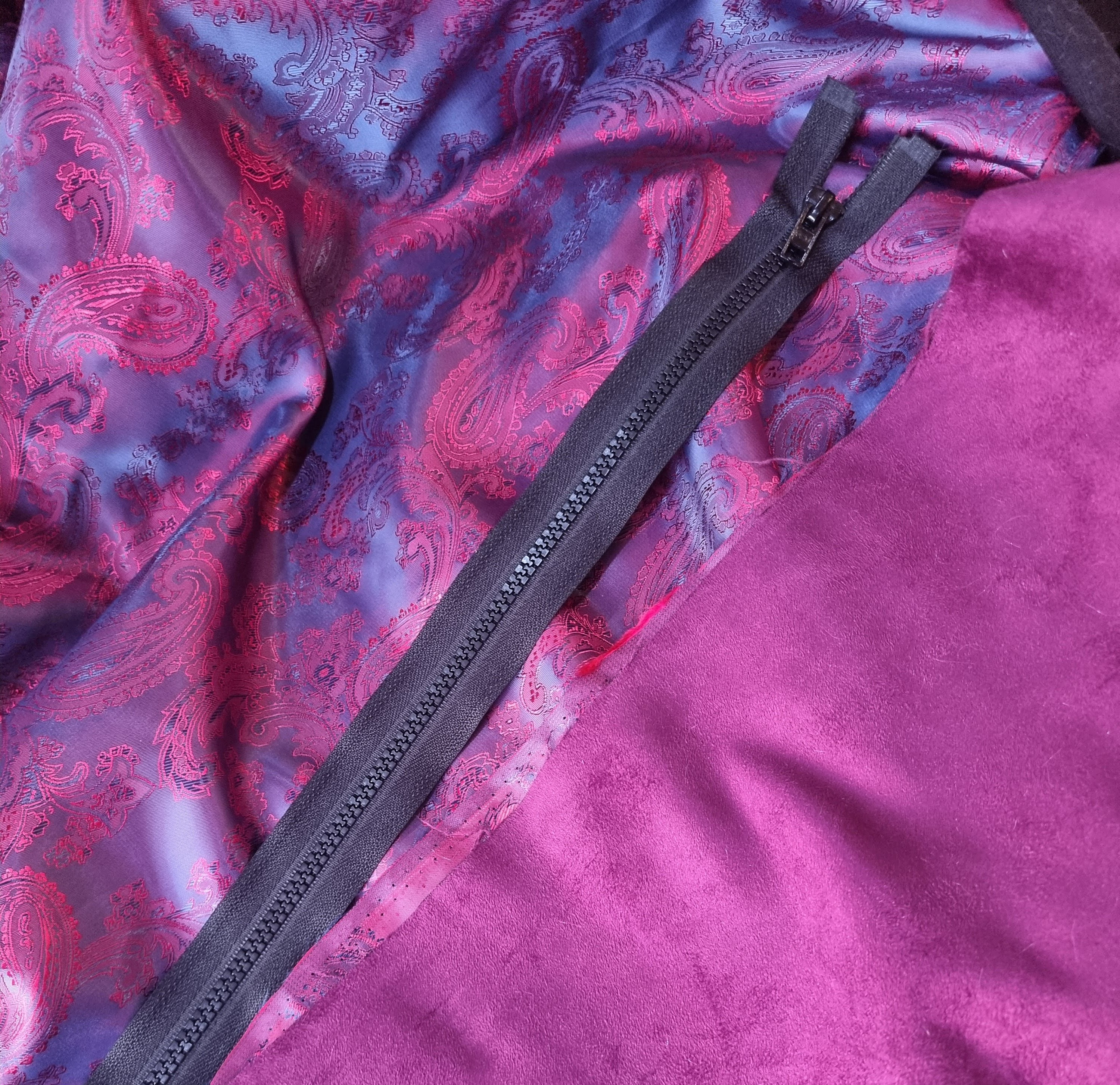 The jacket has a chunky separating zip as a closure at the centre front. Putting the two pieces right sides together, I sandwiched the zip between the two layers and stitched it up.