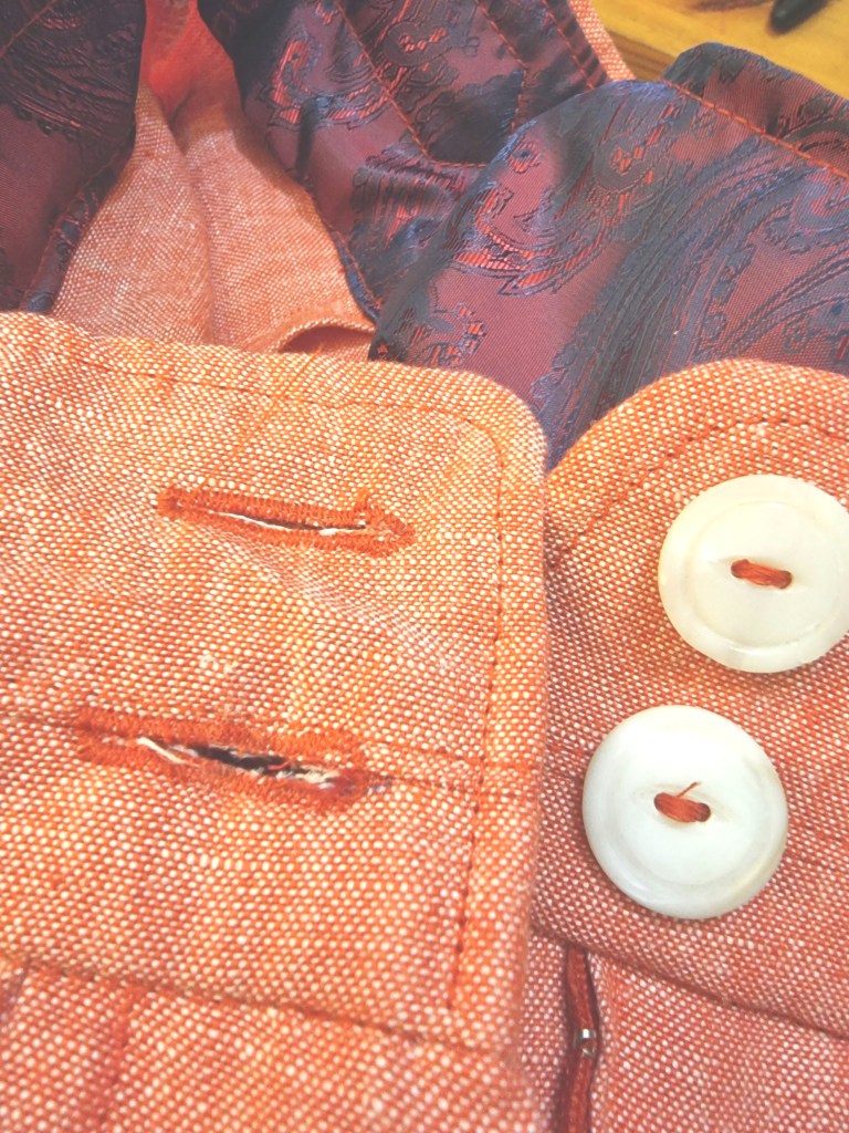 Creating the details of this piece was such a pleasure. I became immersed in the process of cutting matching and applying the embellishments to the waistband. The topstitching in red and some bold shell buttons from the stash added the final pizzazz. Even though I know I’ll be the only one to see much of these details, making them was so satisfying.