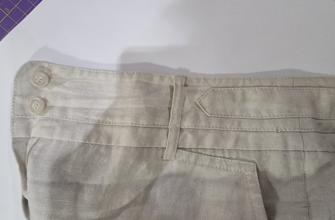 The waistband is quite deep, about 8 centimetres in total and it’s actually made in 2 tiers: a top section of about 6 centimetres and a bottom tier of a further 2 centimetres it has double belt loops and a lovely applique tab detail which I want to try to remake.