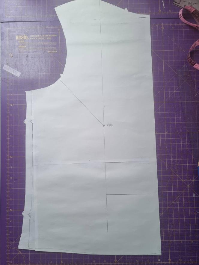 Four cuts are needed, the first is a vertical line down through the apex point, the second is a line from the apex to the arm scye, the third is from the apex to the side seam and finally a line that is perpendicular to the original grainline. this allows additional length because when the slash is spread it will make the centre front rise and the side becomes longer, so some additional length is needed there.