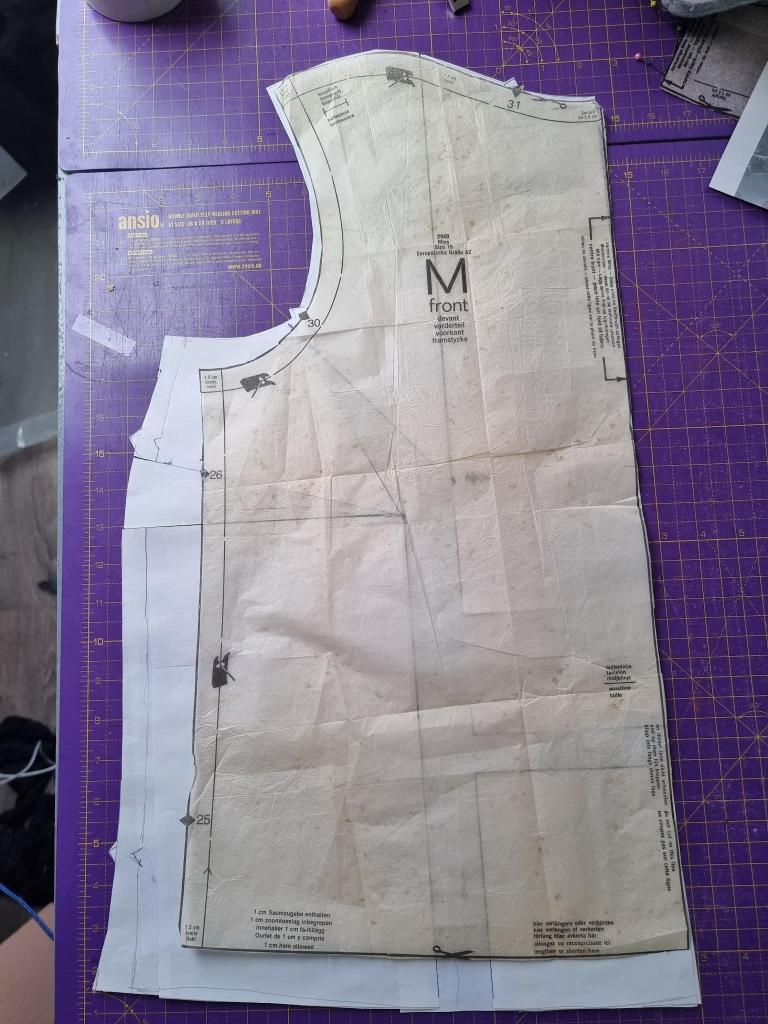 As this top has a facing I have to redraft it to fit the new pattern piece. I did this by simply tracing the top of the new front piece and adding a curved line 5 cm deep for the facing.
