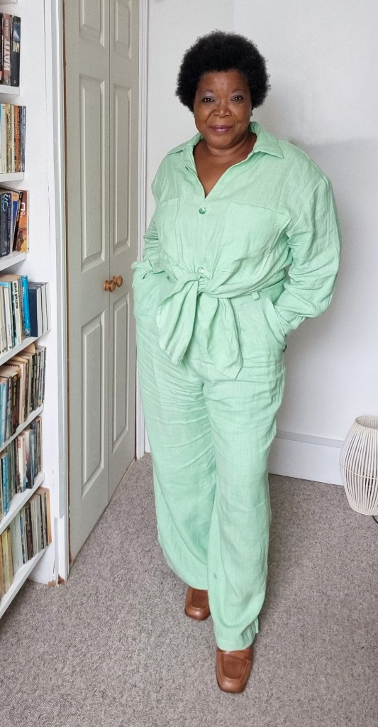 I always say sewing trousers is quite straightforward, it’s fitting them which is a bugger. I graded the size up to an 18 and checked the crotch measurements to see if I needed to adjust that. It’s loose fitting so I didn’t need to change it much. When I made this outfit the first time around, I had very standard proportions and things fit straight out of the packet. However, now, not only is everything bigger but my waist and hips are in different size brackets. The trousers have two deep pleats in the front and I figure if the need arises, I could let them out a bit to accommodate my waist.