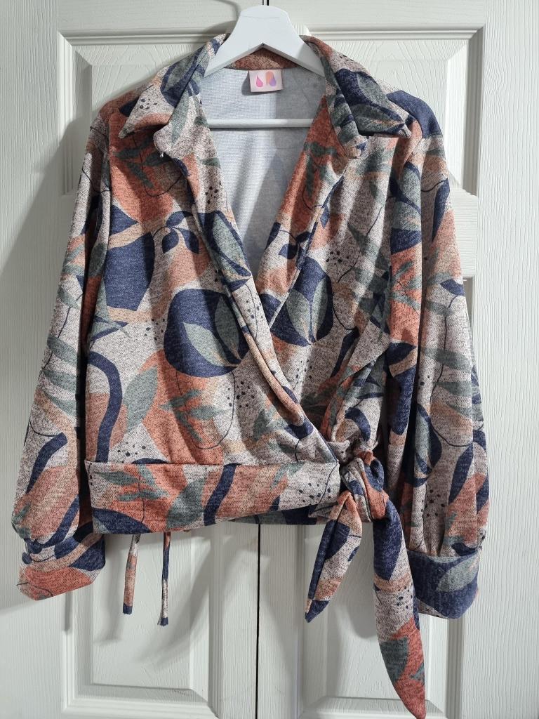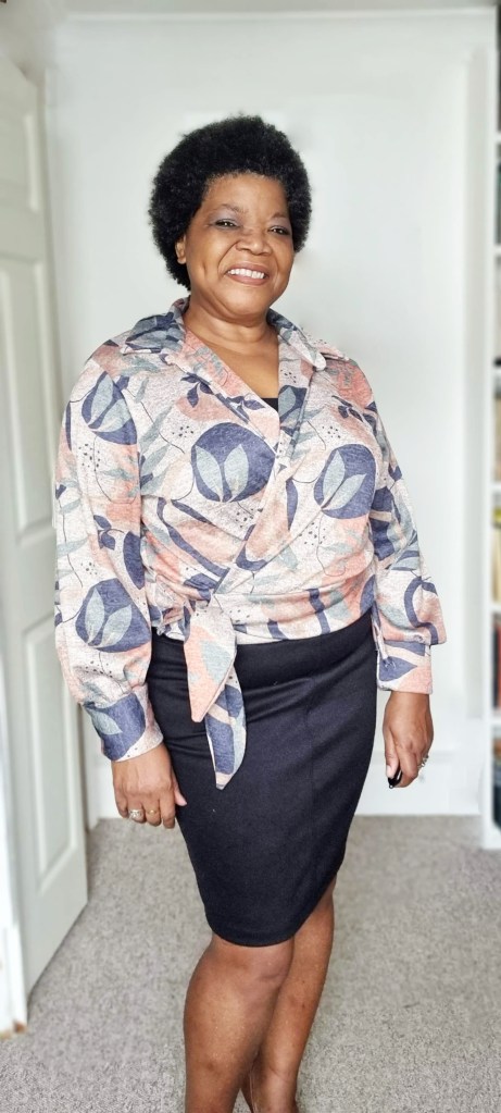 To make the blouse, I used the top half of the Atlas wrap dress from Sewing by Masin which I made a month or so ago. I cut out the top section in size F as I did with the dress, but in addition, I made a 2.5 cm FBA to give me more room in the bust and left off the pocket. I made the collar as per the pattern and the cuffs are just tubes of fabric made large enough for me to pass my fist through. I then added a deep waistband with ties and tabs attached so it can be secured in the same way as the dress. I have slight regrets about pattern placement with the two large circular blobs being in unfortunately prominent positions but I’ll get over it.